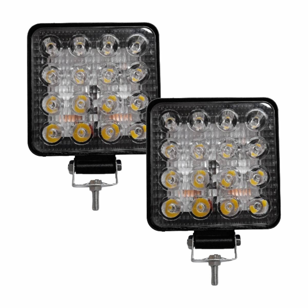 Par de Farol de trabalho quadrado EDN com 16 LEDs de alto brilho, potência de 48W e tensão de operação de 10V a 30V. Estrutura em alumínio com dissipador térmico integrado, lente de policarbonato resistente a impactos e vedação à prova d’água, garantindo desempenho mesmo em condições severas.