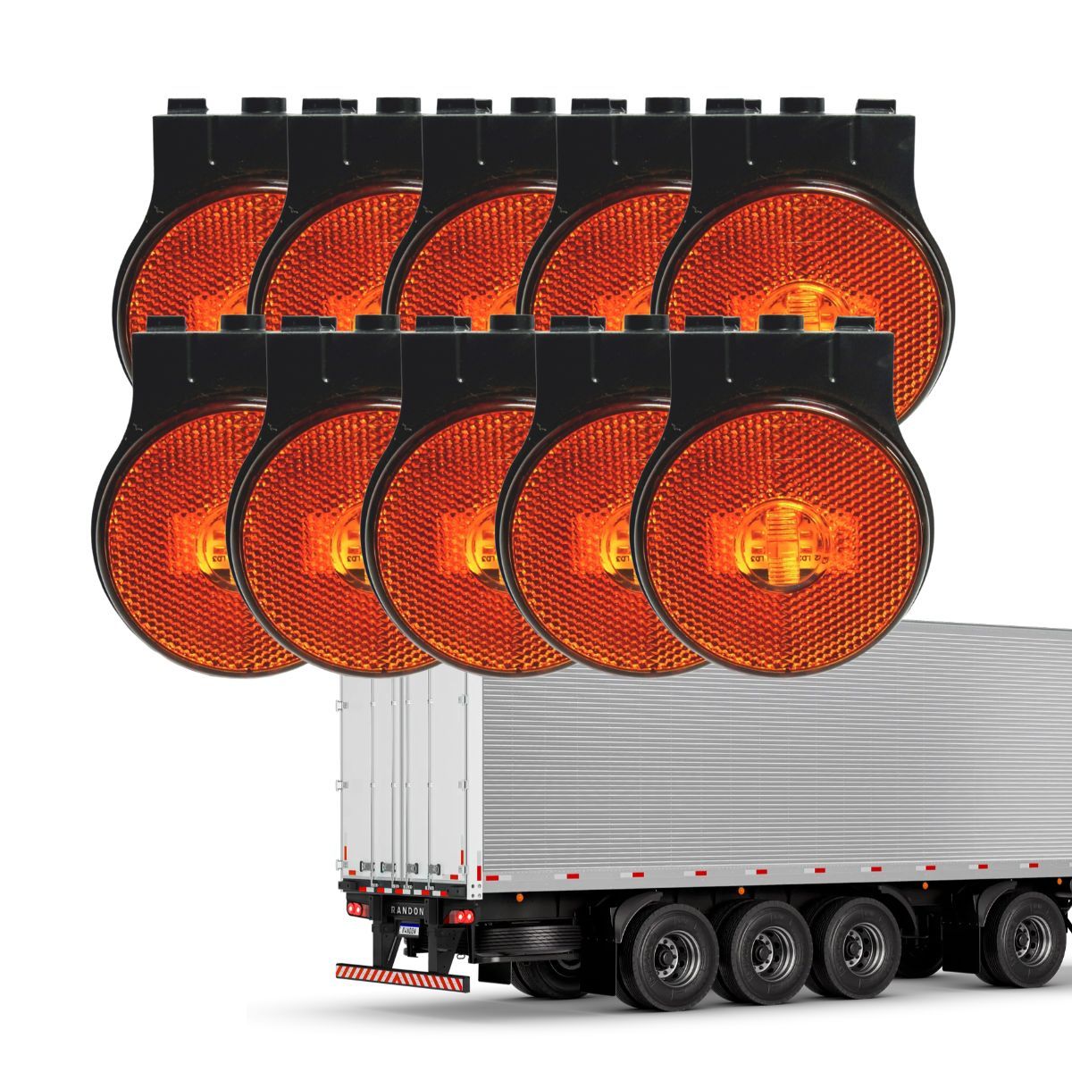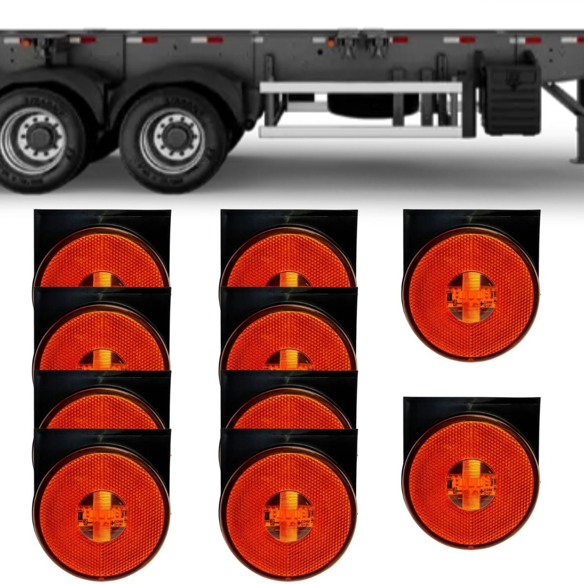 Compatível com implementos fabricados segundo padrão Randon para sinalização lateral de 65 mm, com sistema bivolt e conector padrão, ideal para instalação em carretas e semirreboques conforme normas de trânsito.