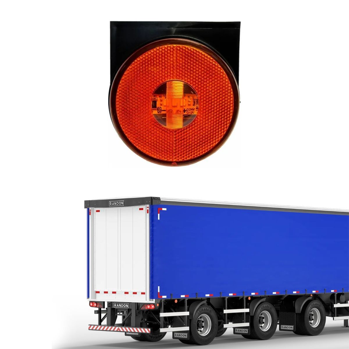 Compatível com implementos e veículos fabricados segundo padrão Randon de 85 mm, com instalação por suporte superior e conexão por fios, ideal para sistema de sinalização lateral conforme legislação vigente.