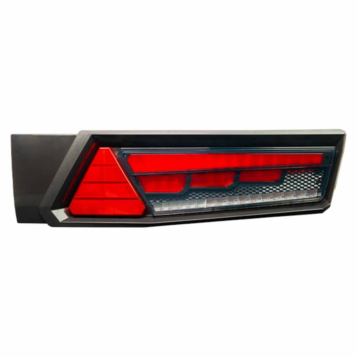 Lanterna traseira LED bivolt modelo Wings da marca Braslux, lado direito. Indicada para veículos pesados e implementos rodoviários, oferece alta visibilidade com tecnologia LED, baixo consumo e maior durabilidade. Lente em policarbonato resistente a impactos, proteção contra água e poeira, com fixação segura.