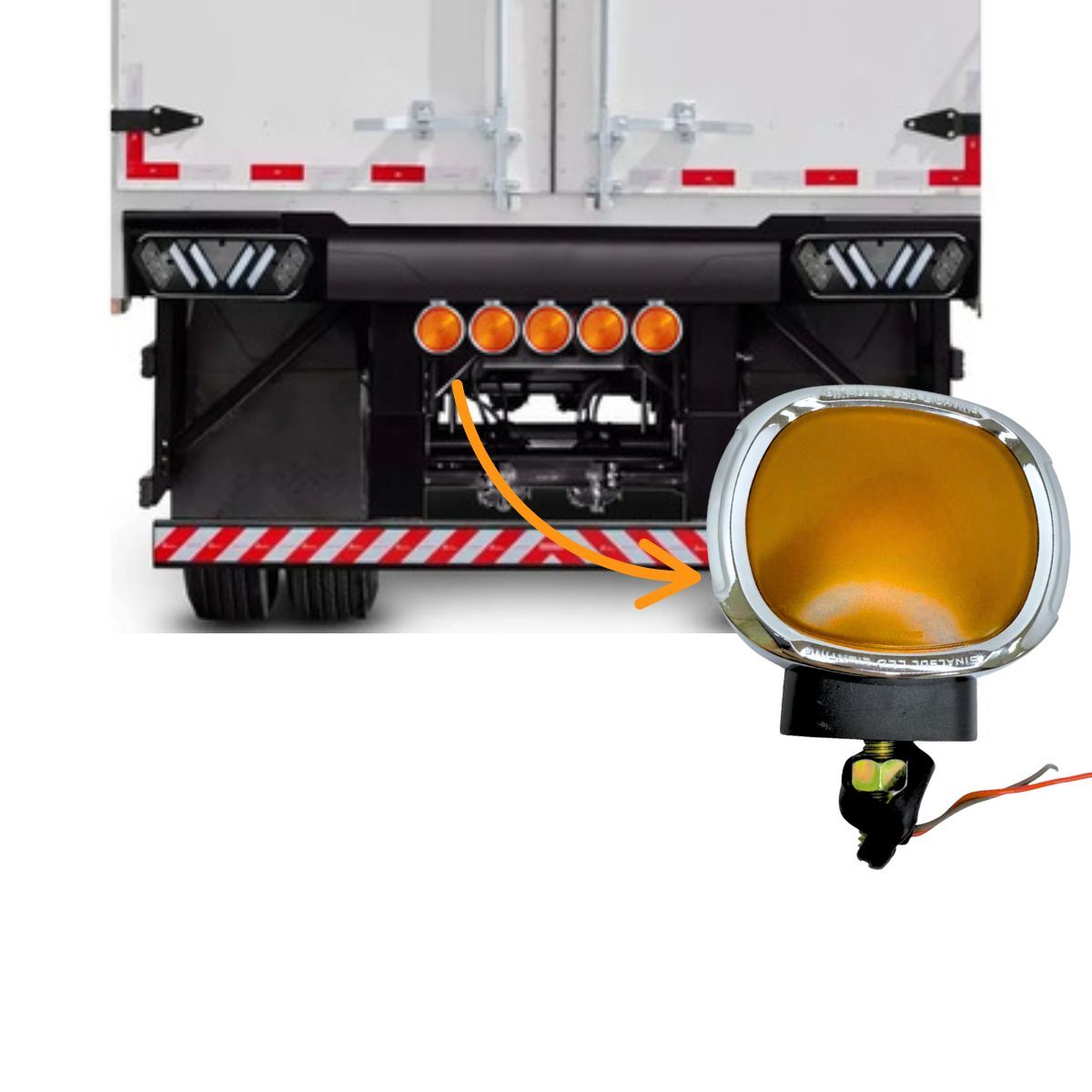 Lanterna traseira LED universal com suporte cromado da SinalSul, ideal para instalação em para-choques de carretas, implementos rodoviários e veículos comerciais. Funciona em sistemas de 12V ou 24V (bivolt), com lente âmbar de alta visibilidade.