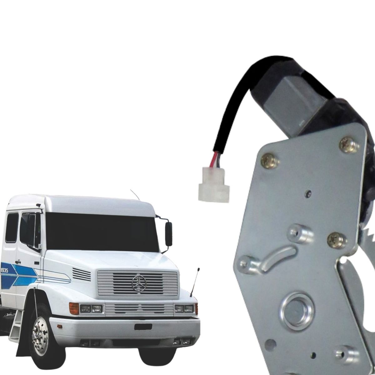 Reposição ideal para máquina de vidro elétrica com motor 24V do lado direito em caminhões Mercedes-Benz 709, 710, Atron e 1935, garantindo compatibilidade total, instalação rápida e desempenho igual ao original.