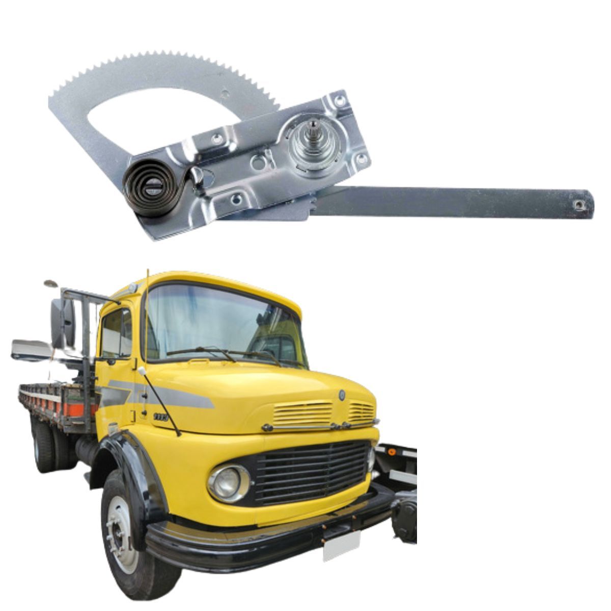Reposição ideal para máquina de vidro manual do lado esquerdo em caminhões Mercedes-Benz 1973 a 1982 com pino curto, assegurando compatibilidade e funcionamento igual ao original de fábrica.