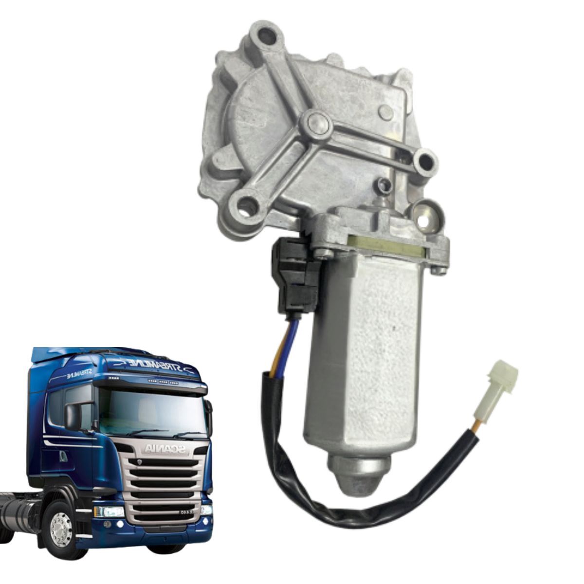 Motor para máquina de vidro elétrico 24 V, lado direito (passageiro), com motor Mabuchi de 10 dentes, destinado às linhas Scania Série 4, Série 5 e Volvo FH (até 2015). Ideal para reposição com encaixe original e operação silenciosa.