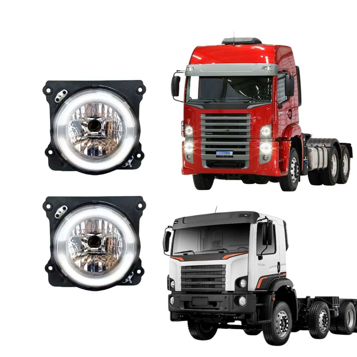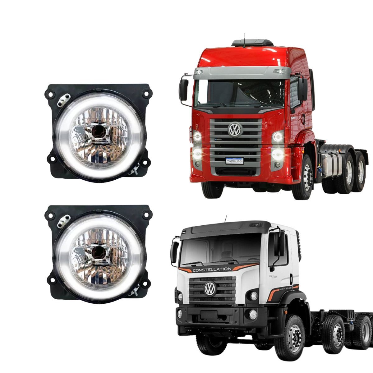 Farol dianteiro lado direito e esquerdo com lâmpada H4 e luz diurna DRL em LED, desenvolvido para os caminhões Volkswagen Constellation a partir de 2023 (versão Euro 6). Produto com tecnologia 24V, lente em policarbonato e carcaça reforçada, proporcionando alta durabilidade e excelente desempenho de iluminação com design moderno.