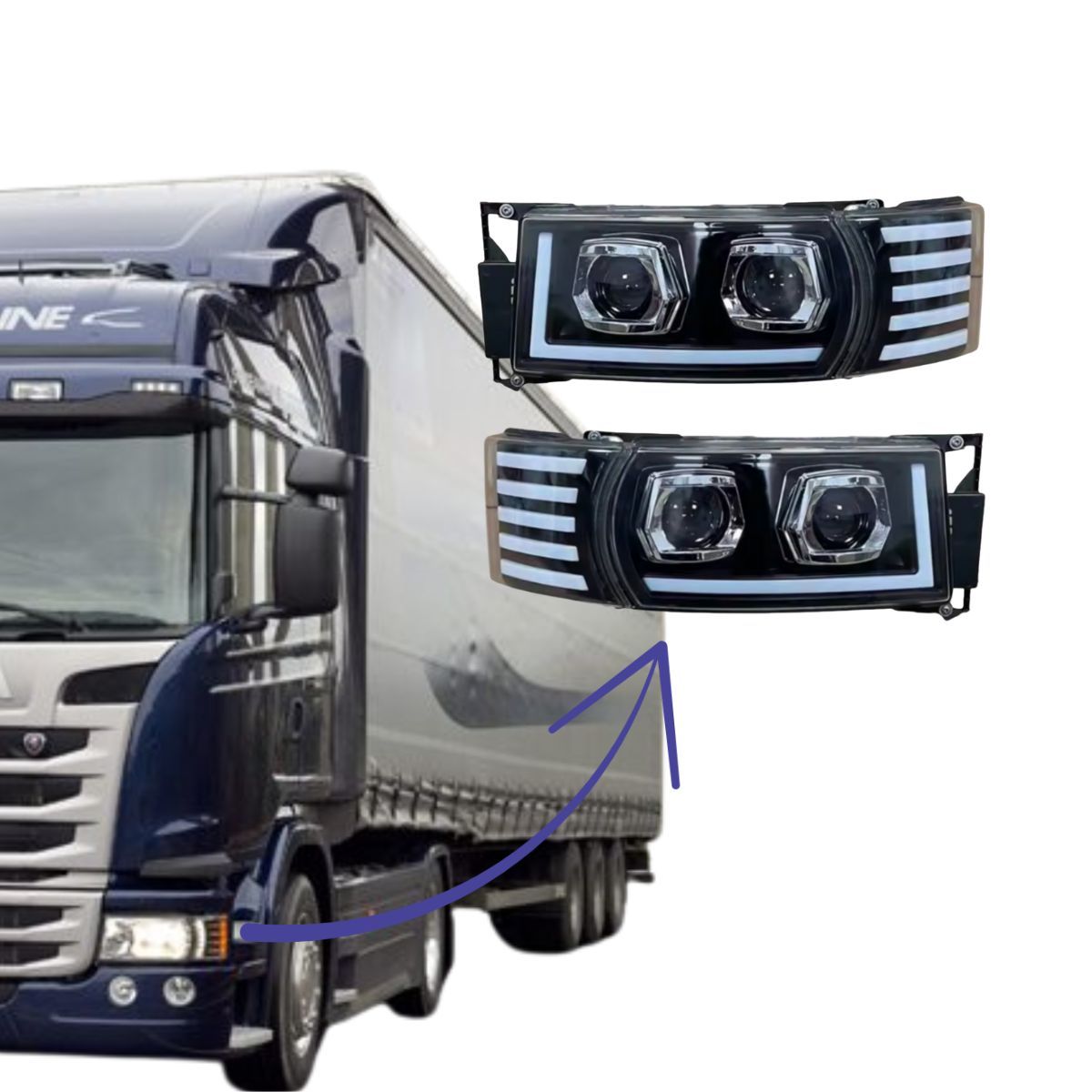 Farol principal lado esquerdo e direito Full LED para caminhões Scania das Séries 4 e 5 (linha P, G, R). Modelo com luz baixa e alta em LED de alta performance, pisca integrado e encaixe padrão original. Acabamento robusto, com lente em policarbonato resistente a impactos e vedação reforçada para garantir durabilidade e segurança em diferentes condições de estrada.